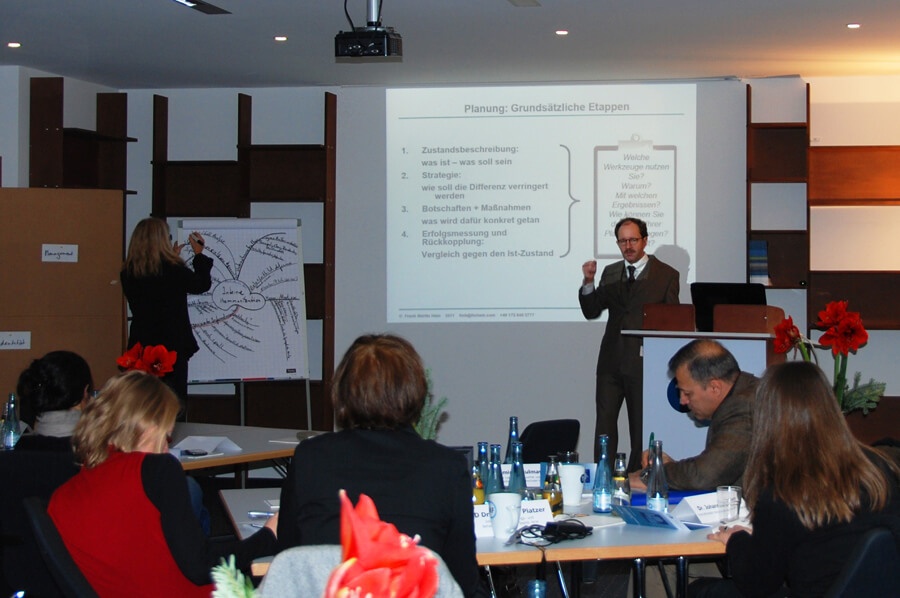 Der Kommunikationsexperte Frank-Martin Hein gab viele konkrete Tipps. Eine gute Übung, so Hein, sei beispielsweise der so genannte „Elevator-Pitch“: Es gilt, den Verbund und seine Kernbotschaft spontan in 60 bis 120 Sekunden strukturiert, verständlich und einprägsam vorstellen zu können. Er wies insbesondere auch auf die Bedeutung der einer für die Zielgruppe passenden, kraftvollen und – wo sinnvoll – bildhaften Sprache hin.