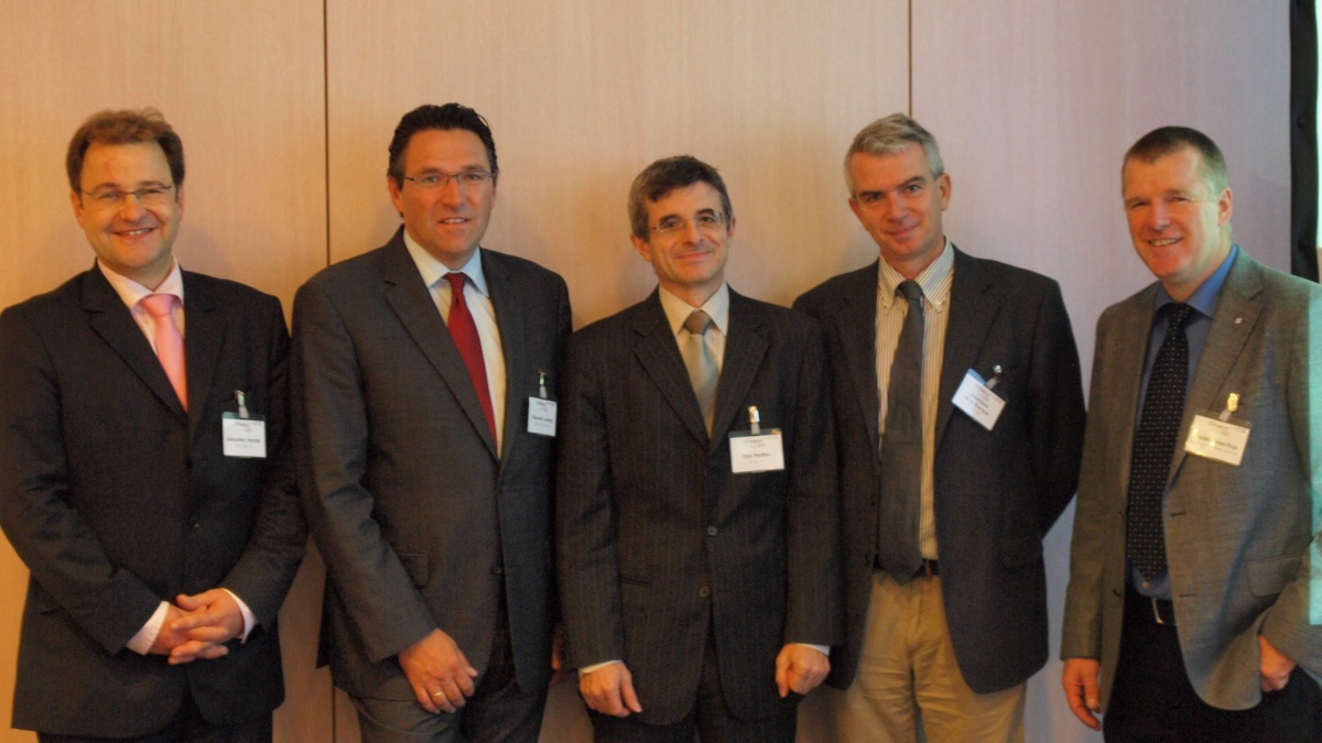 Die internationalen Keynote-Referenten und die drei Standortleiter der Zoonosenplattform kamen vor dem Start des Symposiums zu einem Pressegespräch zusammen. V.l.n.r.: Sebastian C. Semler (TMF, Berlin), Prof. Dr. Stephan Ludwig (Institut für Molekulare Virologie, Universität Münster), Prof. Dr. Dirk Pfeiffer (Royal Veterinary College, London), Dr. Stephane de la Rocque (Food and Agriculture Organization der UN, Rom), Prof. Dr. Martin Groschup (Friedrich-Loeffler-Institut, Greifswald - Insel Riems). © TMF e.V.