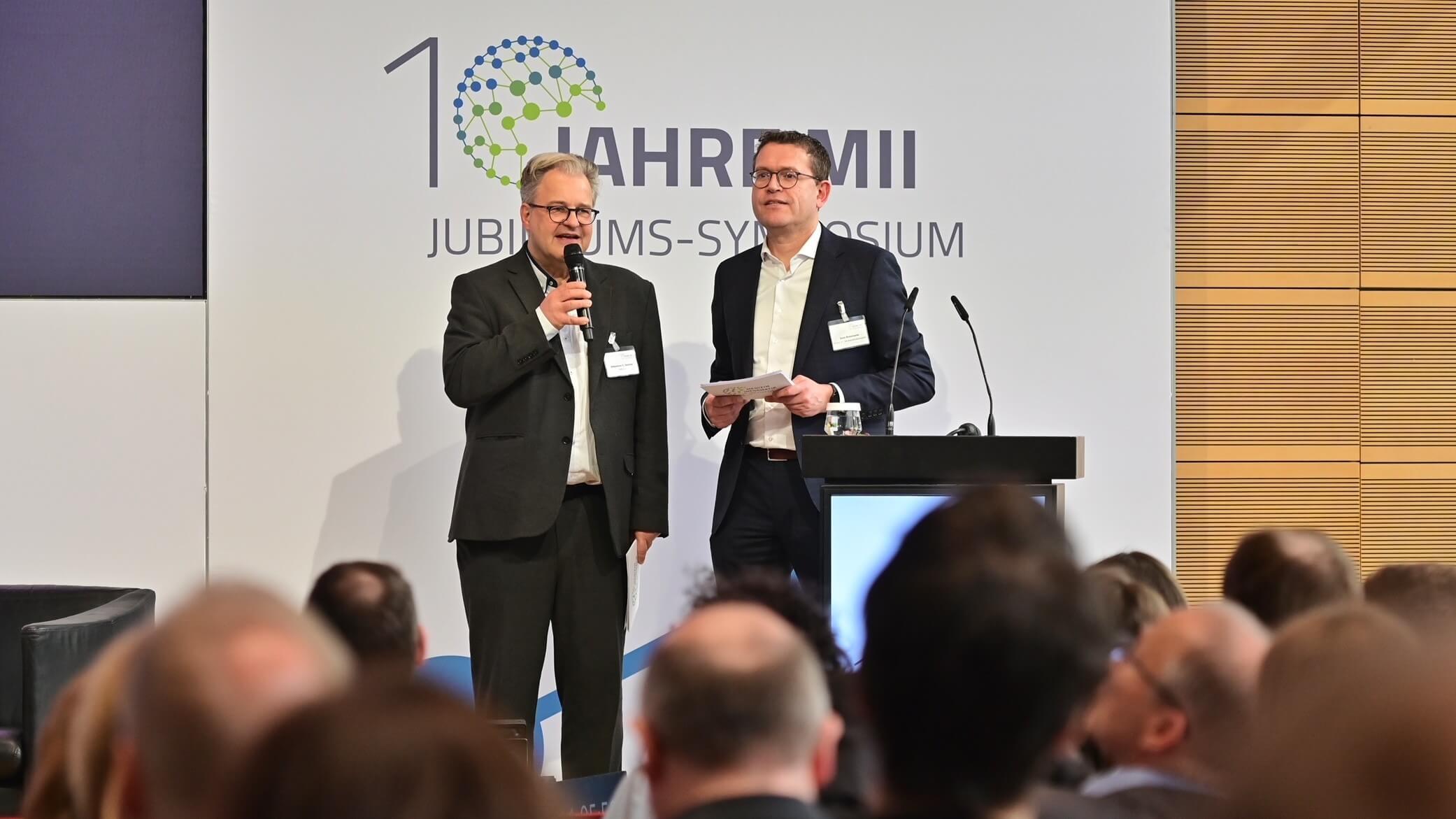 V. l. n. r.: Sebastian C. Semler, TMF-Geschäftsführer und Leiter der MII-Koordinationsstelle, und Jens Bussmann, Verband der Universitätsklinika Deutschlands. © TMF e. V.