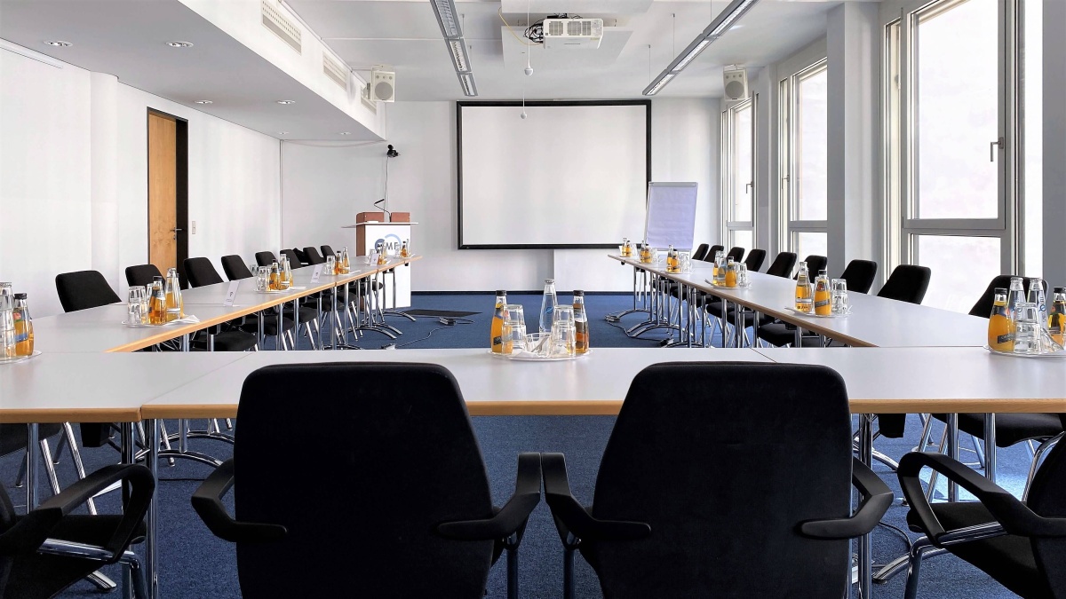 - Konferenzraum 1: fest installierter Beamer und Leinwand (VGA/HDMI) mit 6.000 ANSI-Lumen, Tonanlage für Sprachbeschallung und Präsentationen